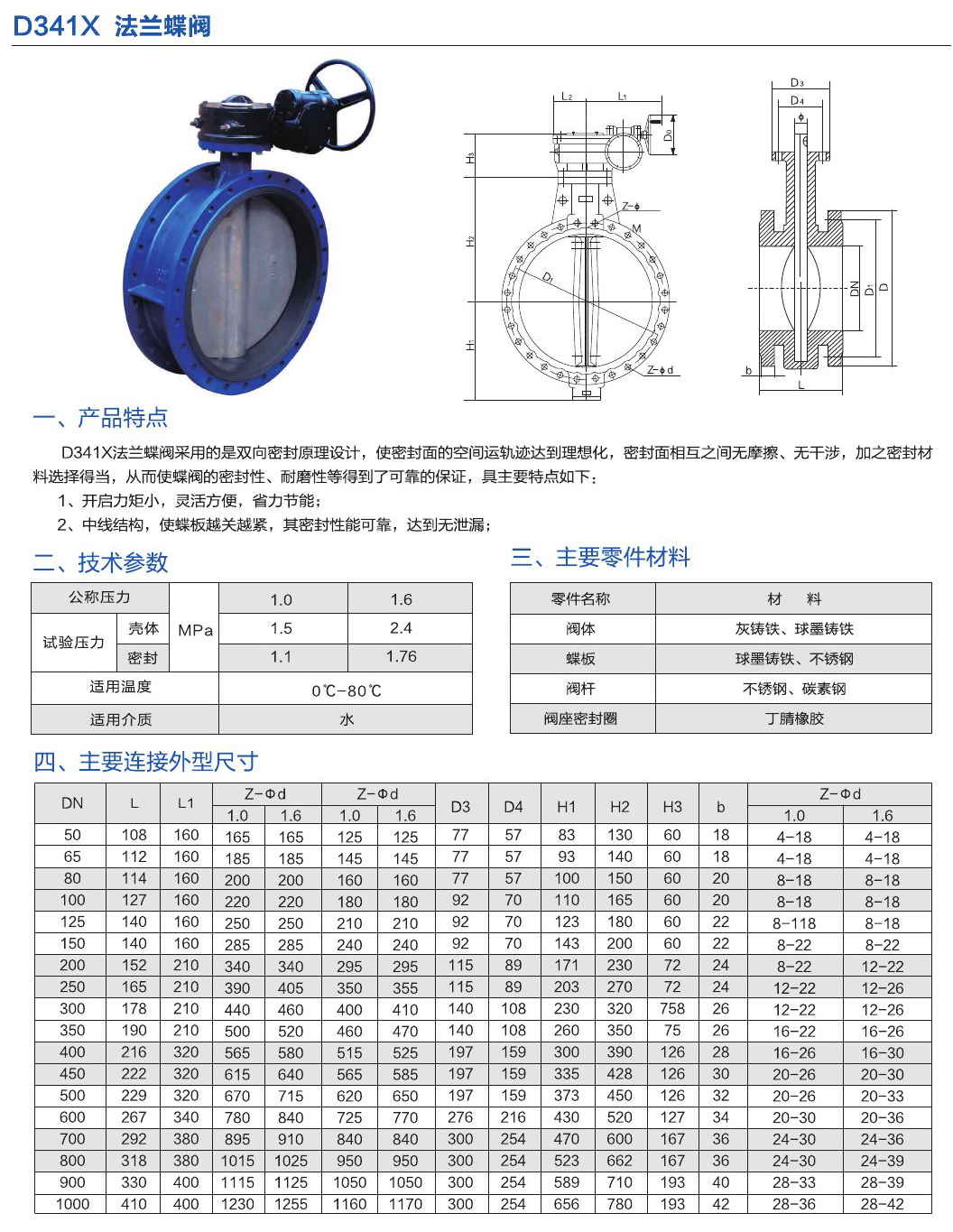 - D341X法蘭蝶閥采用的是雙向密封原理設(shè)計,使密封面的空間運軌跡達到理想化,密封面相互之間無摩擦、無干涉,加之密封材料選擇得當(dāng),從而使蝶閥的密封性、耐磨性等得到了可靠的保證。