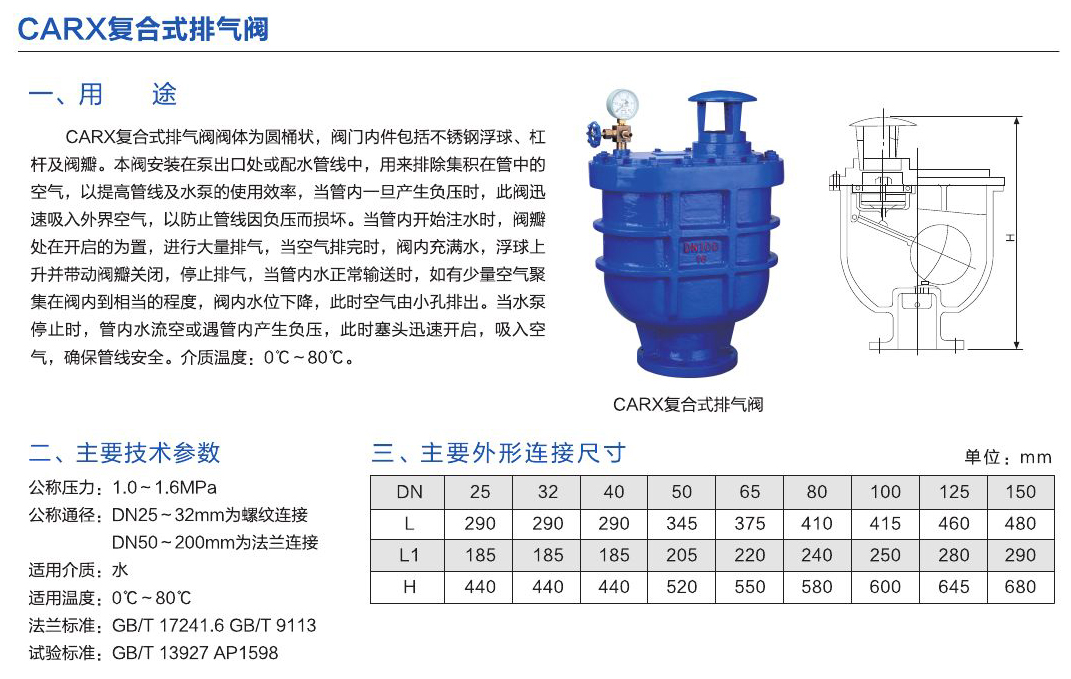 - CARX復(fù)合式排氣閥閥體為圓桶狀,閥門內(nèi)件包括不銹鋼浮球、杠桿及閥瓣。