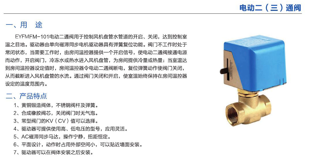 - LGDZFM-101電動(dòng)二通閥用于控制風(fēng)機(jī)盤管水管道的開啟、關(guān)閉,達(dá)到控制室溫之目地。