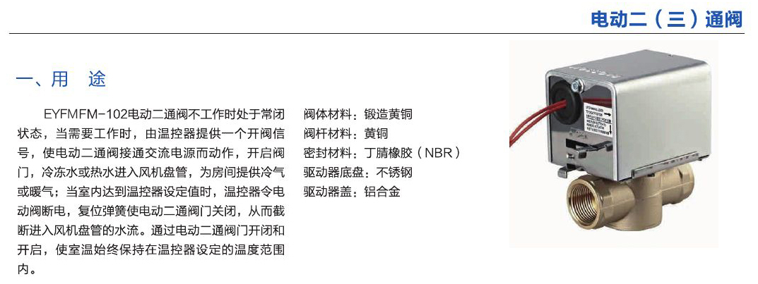 - LGDZFM-102電動二通閥不工作時處于常閉狀態(tài),當(dāng)需要工作時,由溫控器提供一個開閥信號,使電動二通閥接通交流電源而動作,開啟閥門,冷凍水或熱水進(jìn)入風(fēng)機(jī)盤管,為房間提供冷氣或暖氣。