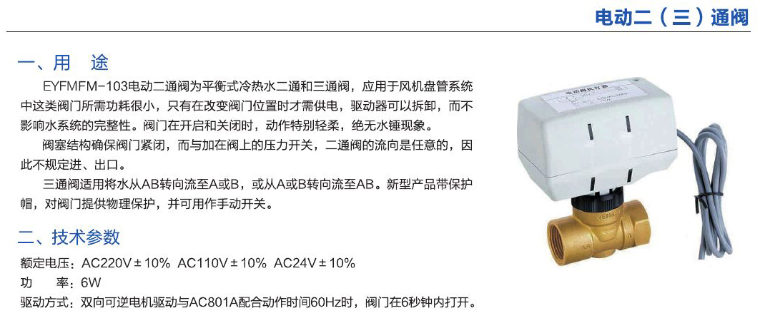 - LGDZFM-103電動二通閥為平衡式冷熱水二通和三通閥,應(yīng)用于風(fēng)機(jī)盤管系統(tǒng)中這類閥門所需功耗很小,只有在改變閥門位置時才需供電,驅(qū)動器可以拆卸,而不影響水系統(tǒng)的完整性