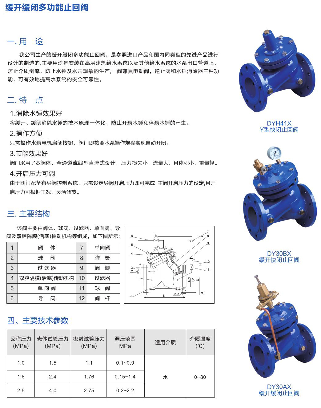 - 安裝在高層建筑給水系統(tǒng)以及其化給水系統(tǒng)的水泵出口管道上,防止介質(zhì)倒流,防止水錘及水擊現(xiàn)象的生產(chǎn),一閥兼具電動(dòng)閥,逆止閥和水錘消除器三種功能,可有效地提高水系統(tǒng)的安全可靠性。