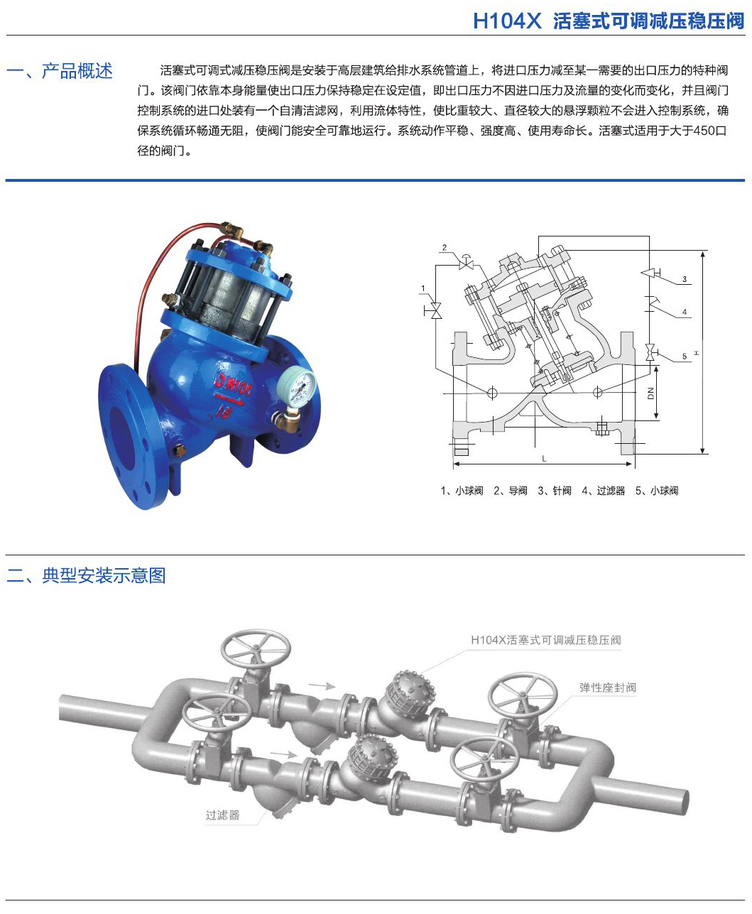 - 活塞式可調(diào)式減壓穩(wěn)壓閥是安裝于高層建筑給排水系統(tǒng)管道上,將進(jìn)口壓力減至某一需要的出口壓力的特種閥門。