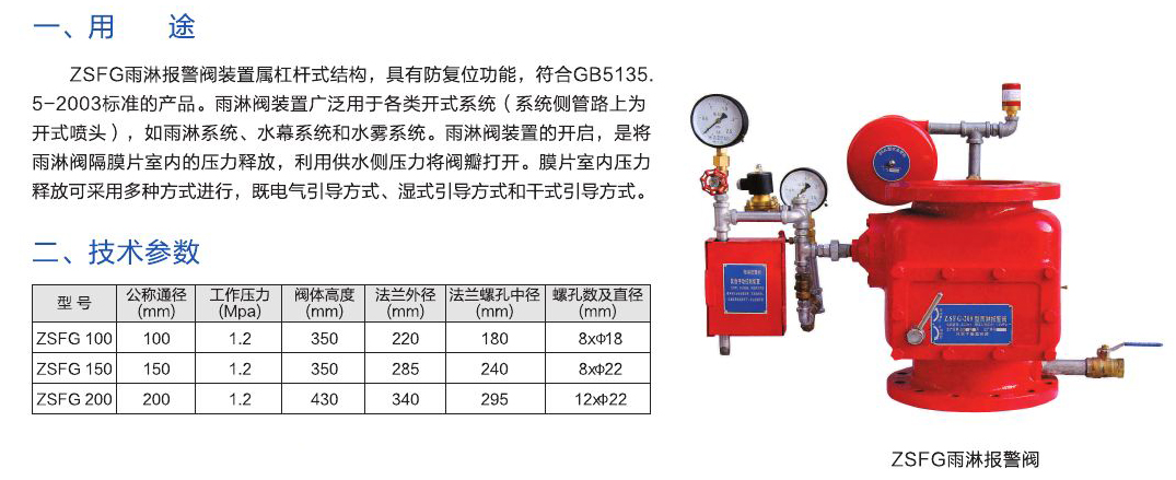 - ZSFG雨淋報警閥裝置屬杠桿式結(jié)構(gòu),具有防復位功能,符合GB5135.5-2003標準的產(chǎn)品。雨淋閥裝置廣泛用于各類開式系統(tǒng),如雨淋系統(tǒng)、水幕系統(tǒng)和水霧系統(tǒng)。