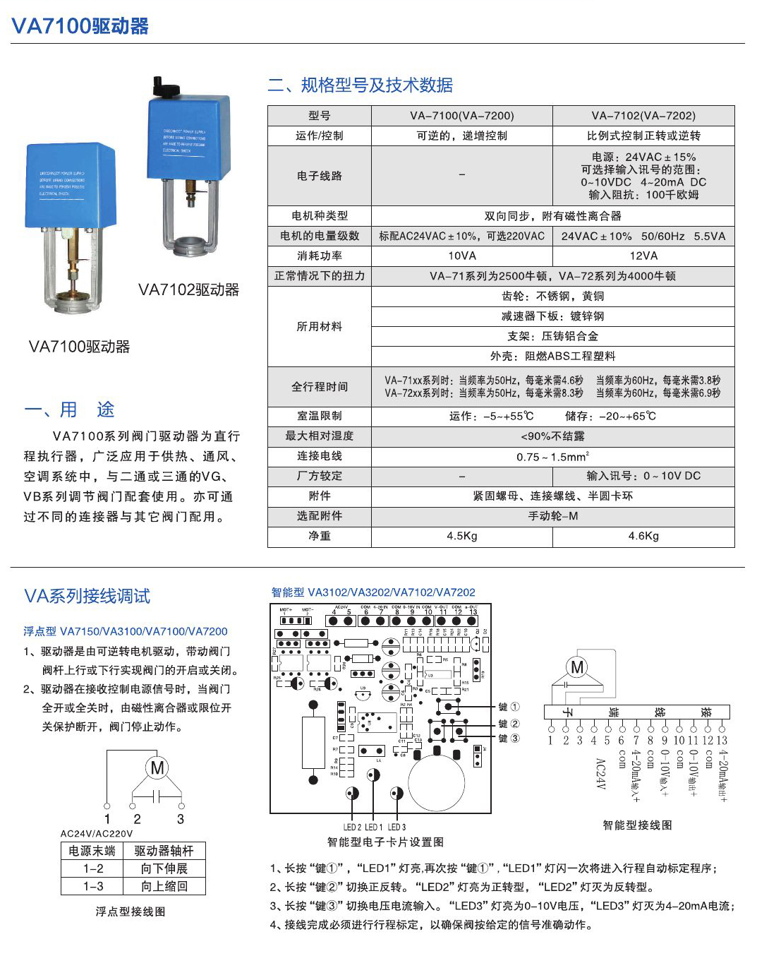 - VA7102系列閥門驅(qū)動(dòng)器為直行程執(zhí)行器,廣泛應(yīng)用于供熱、通風(fēng)、空調(diào)系統(tǒng)中,與二通或三通的VG、VB系列調(diào)節(jié)閥門配套使用。